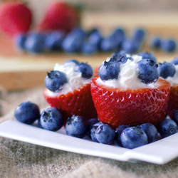 Of course, I made them the easiest way possible by just coring strawberries, using store bought low-fat whipped cream and topping them with blueberries, BUT there are many, many more ways you can make these unique.